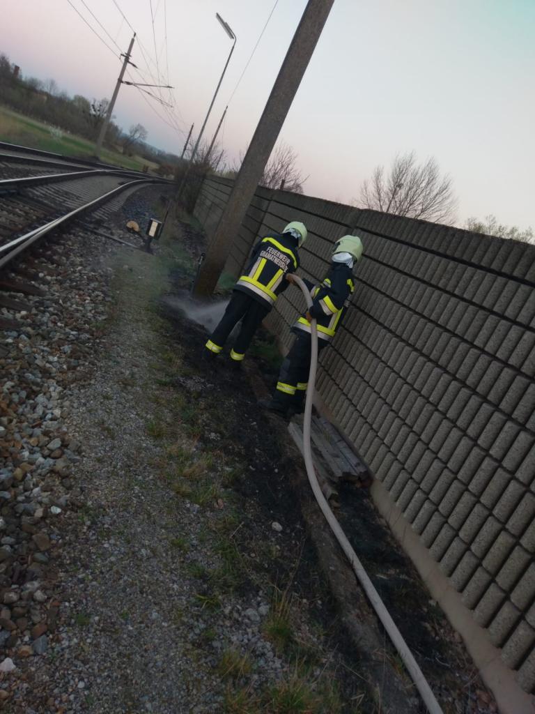 | Zu einem Bahndammbrand wurden wir diesen Nachmittag alarmiert. Nachdem die Meldung allerdings ohne genau Angabe des Brandortes erfolgt war musste dieser erst lokalisiert werden. Das Ablöschen des kleinflächigen Brandherdes war dann sehr rasch erledigt. Der Brandherd lag unmittelbar neben den Gleisen hinter einer Lärmschutzwand. Durch die Nähe zu den Gleisen und der Oberleitung musste besonders vorsichtig vorgegangen werden. |