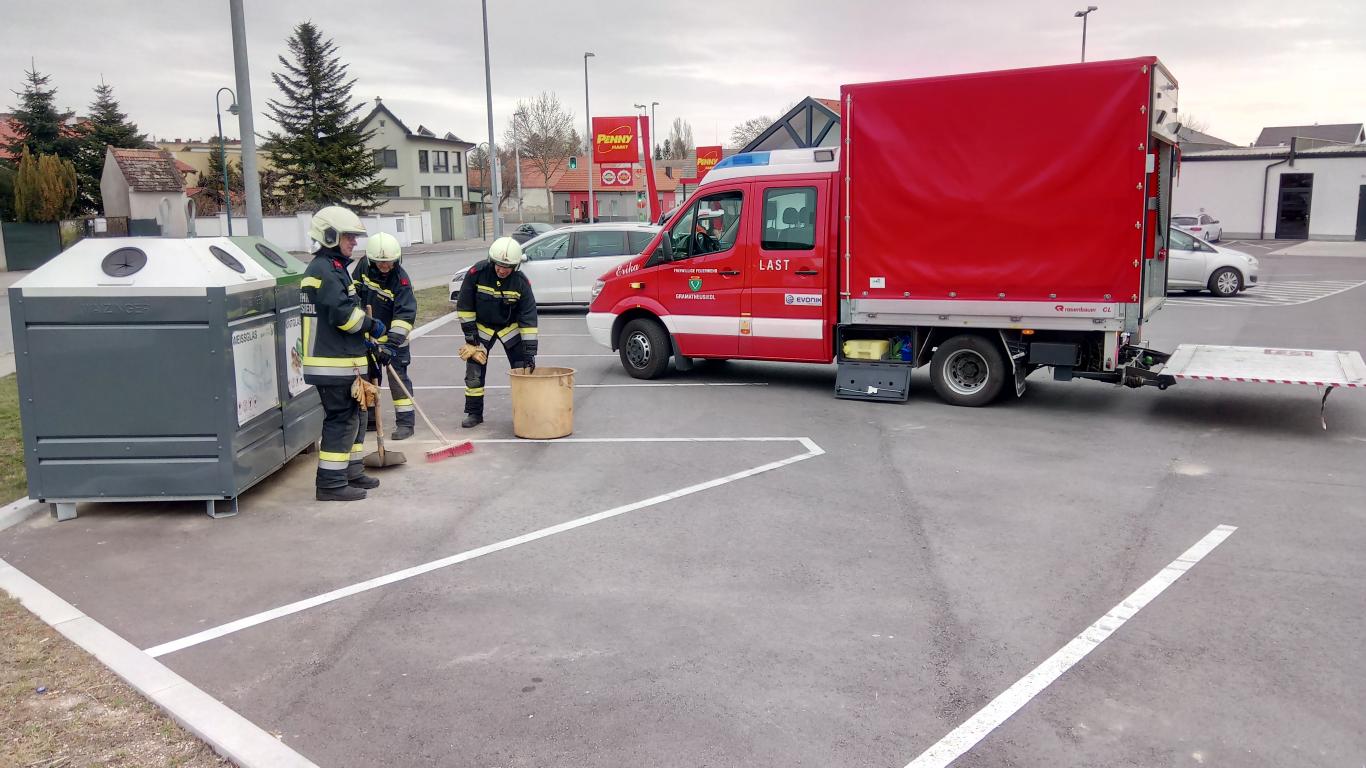 Eine Penny Mitarbeiterin erreichte 3 Kameraden im Feuerwehrhaus die sich dort auf eine Prüfung vorbereiteten. Die 3 Kameraden begaben sich daraufhin mit Ölbindemittel und Auffangbehältnissen zum Einsatzort.