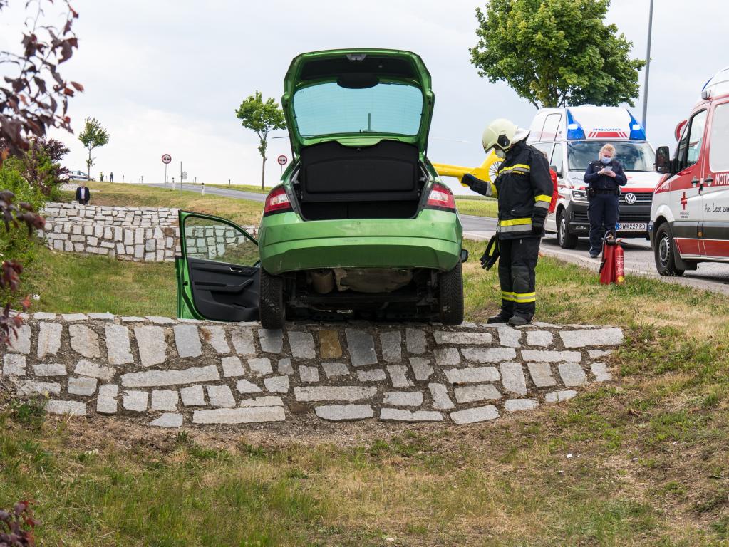 Bei der Anfahrt konnte eines der Unfallfahrzeuge bereits von weitem gesehen werden, da es sich auf einer der Mauern in den Regenwasser-Rückhaltebecken neben der L161 kurz vor der Winzergasse befand.