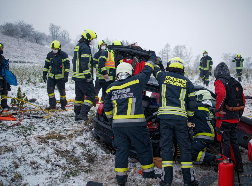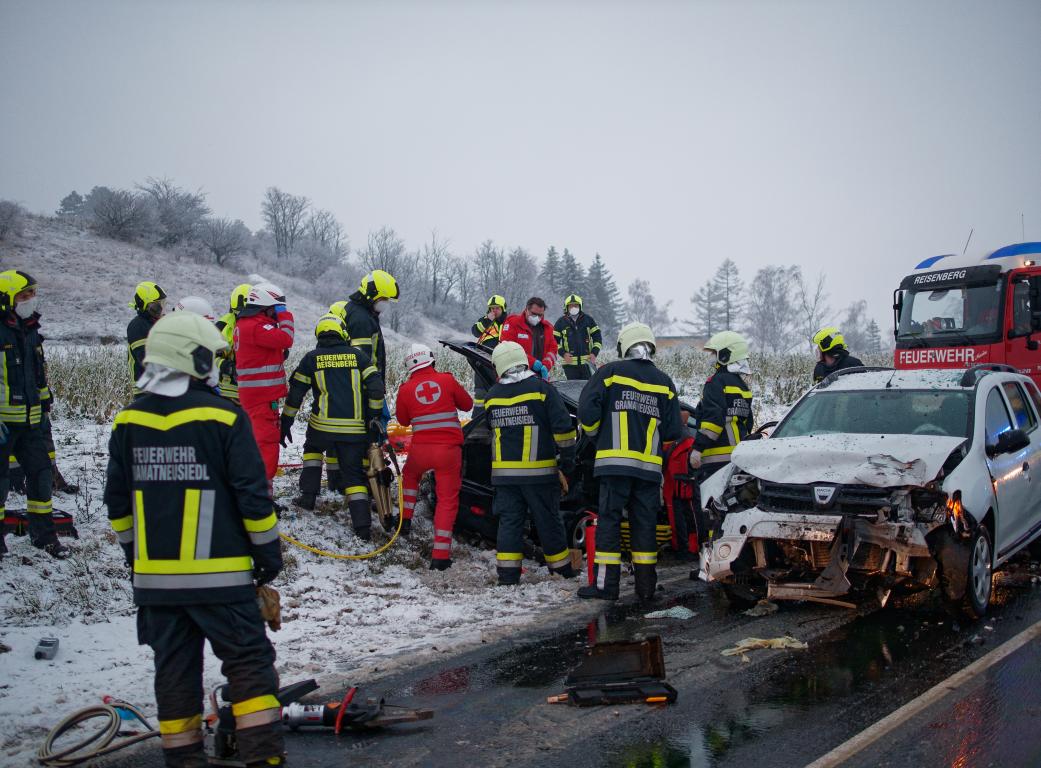 | Heute Morgen wurden wir gemeinsam mit der FF Reisenberg zu einem Verkehrsunfall mit Menschenrettung auf die L161 zwischen Reisenberg und Gramatneusiedl alarmiert. Auf der eisglatten LH161 war ein Fahrzeug auf die Gegenfahrbahn geraten und war mit einen entgegenkommenden PKW kollidiert. Beide Fahrzeuge wurden durch den Zusammenstoß schwer beschädigt. Durch die Wucht des Aufpralls wurden die Insassen beider PKW`s verletzt, teilweise schwer. Beim Eintreffen wurde von uns der Brandschutz übernommen und gemeinsam mit den Kameraden der FF Reisenberg die Rettung einer Person aus einem der Fahrzeuge durchgeführt. Die anderen Verletzten wurden von einem weiteren Rettungswagen versorgt. Insgesamt wurden drei Menschen verletzt, zwei davon schwer. Für den Abtransport eines Verletzten wurde weiters der Notarzthubschrauber Christophorus 9 aus Wien angefordert. Anschließend wurden durch uns noch ausgetretene Betriebsmittel gebunden. Die Bergung der Fahrzeuge übernahmen zwei Wechselladefahrzeuge der Freiwilligen Feuerwehr Ebreichsdorf. Bericht der FF Reisenberg | ||||