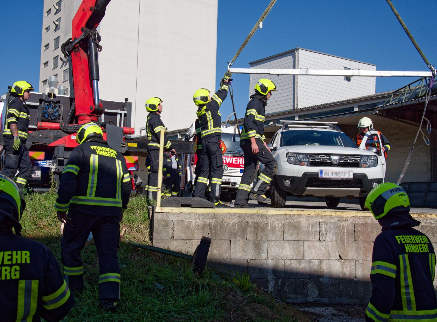 Gemeinsam mit der Feuerwehr Himberg konnte das Auto schließlich wieder auf die Fahrbahn gehoben werden.