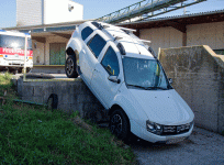 Ein PKW Fahrer hatte von der tiefstehenden Sonne geblendet eine Laderampe mit der Abfahrt verwechselt.