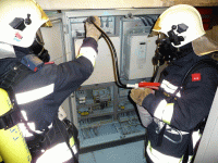 Die Mannschaft des TLF 4000 wurde durch den Einsatzleiter unterwiesen und mit Atemschutz und CO2-Löscher zur Brandbekämpfung eingeteilt.