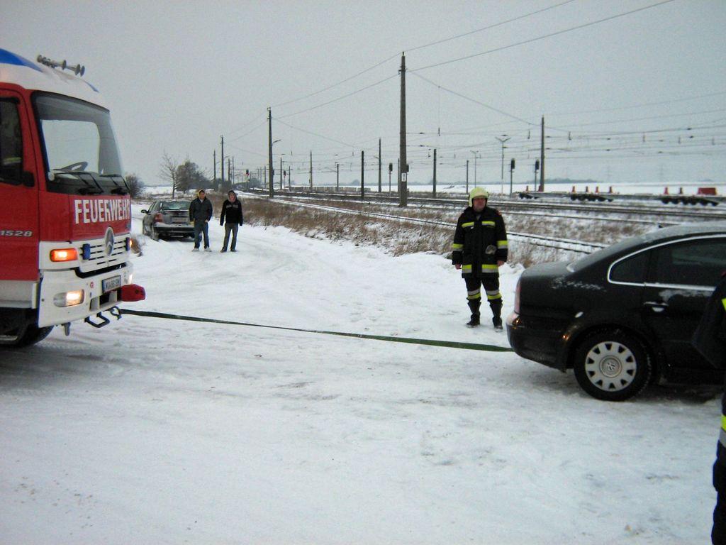 | Heute wurden wir von der Abschnittsalarmzentrale Schwechat zu einer PKW-Bergung gerufen. Bei tiefwinterlichen Witterungsverhältnissen war ein PKW von der Straße abgekommen und war in einer Schneewächte hängen geblieben, sodass der Fahrer sich selbst nicht mehr aus dieser misslichen Lage befreien konnte. Mittels befestigter Bandschlinge zogen wir den PKW zurück auf die Fahrbahn und konnten bereits nach 20 Minuten wieder einrücken. |