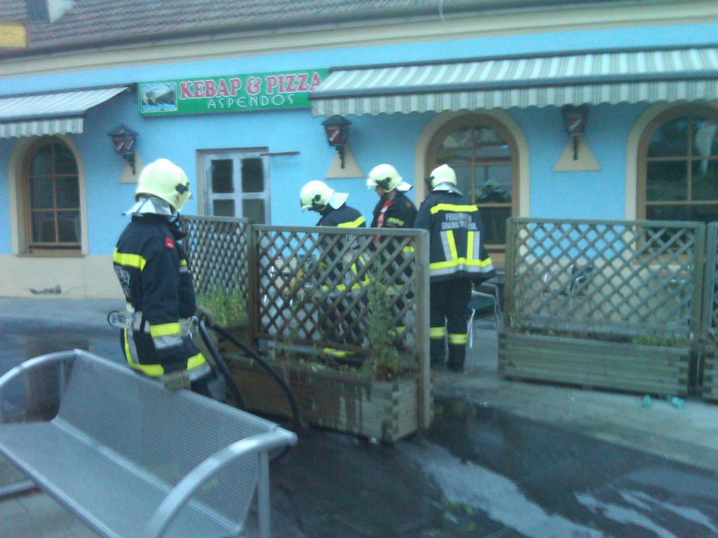 Bereits während der Anfahrt ins Feuerwehrhaus konnten wir erkennen das es sich bei dem Brandverdacht zwar einerseits tatsächlich um einen Brandeinsatz handelte und andererseits nicht das Kebap Haus brannte sondern lediglich 2 Blumentröge vor dem Kebap Haus.