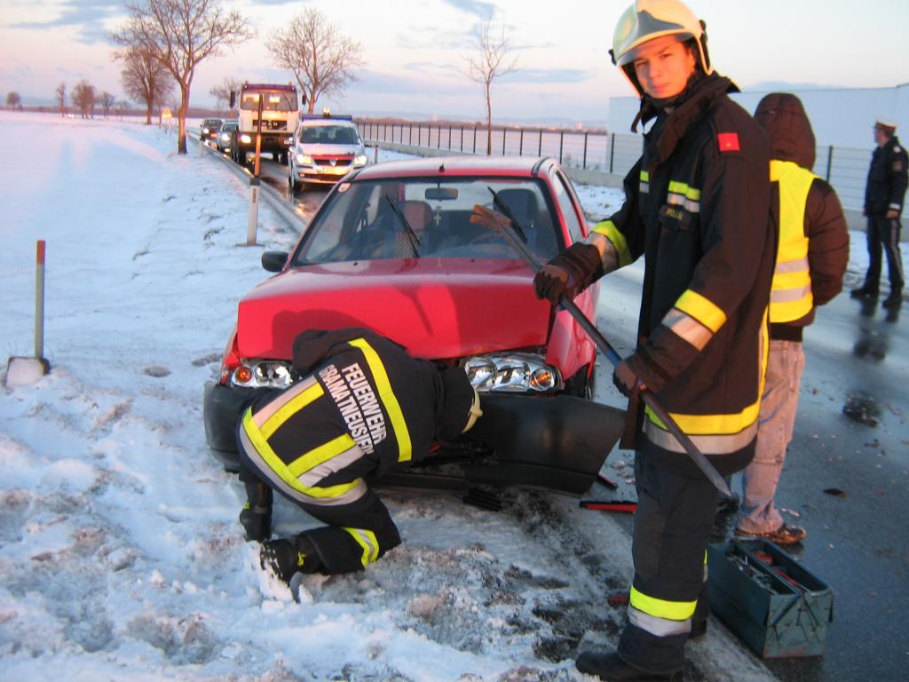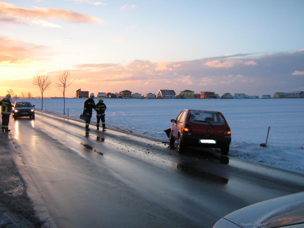 Eines der Unfallfahrzeuge rutschte dabei in den Straßengraben. Nachdem wir das Fahrzeug auf der Taborskystrasse abgestellt hatten, reinigten wir noch die Fahrbahn von den Unfallfolgen.