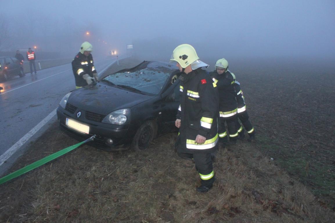 Die Unfallstelle wurde abgesichert und mittels Feuerlöscher der Brandschutz hergestellt, desweiteren wurde das Fahrzeug auf die Räder gestellt und mittels TLF2000 und Bandschlinge auf die Fahrbahn gezogen.